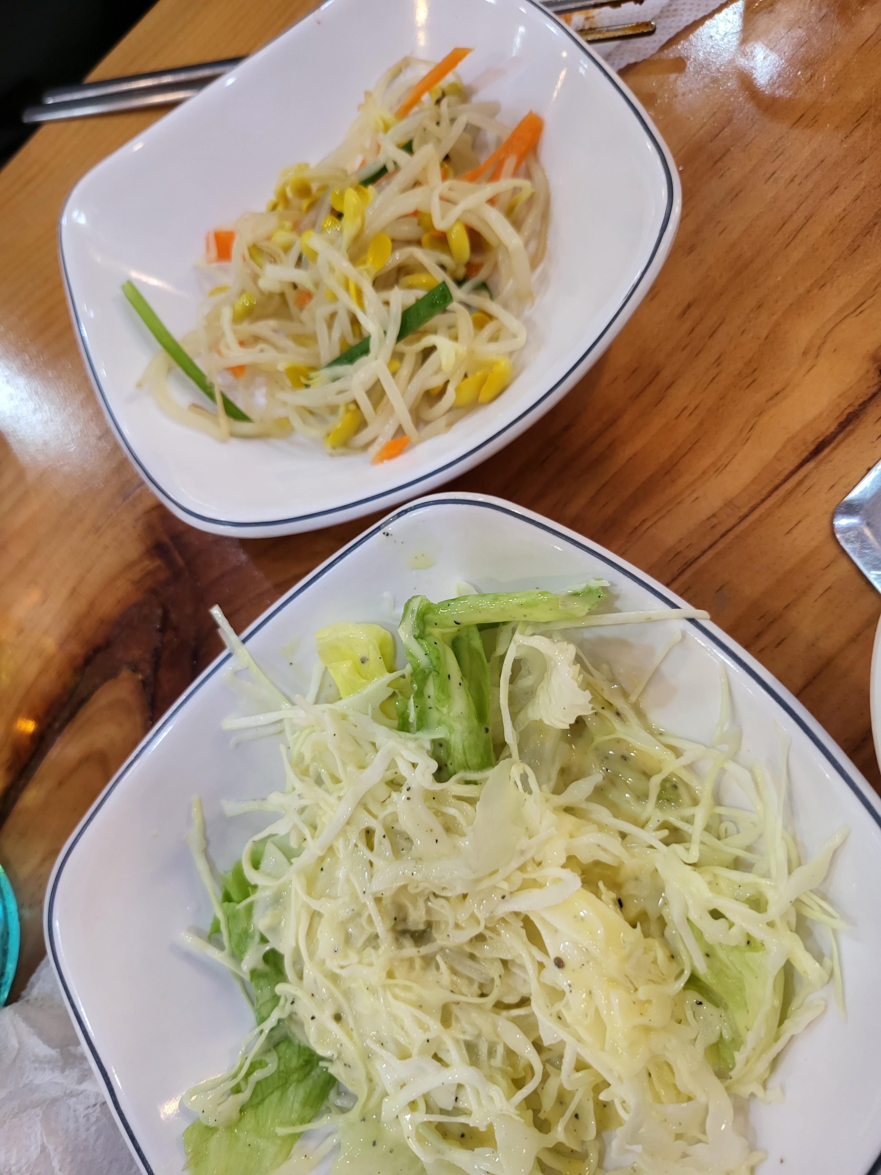 밑반찬으로 콩나물무침 미역냉국 샐러드 순두부 나왔어요.