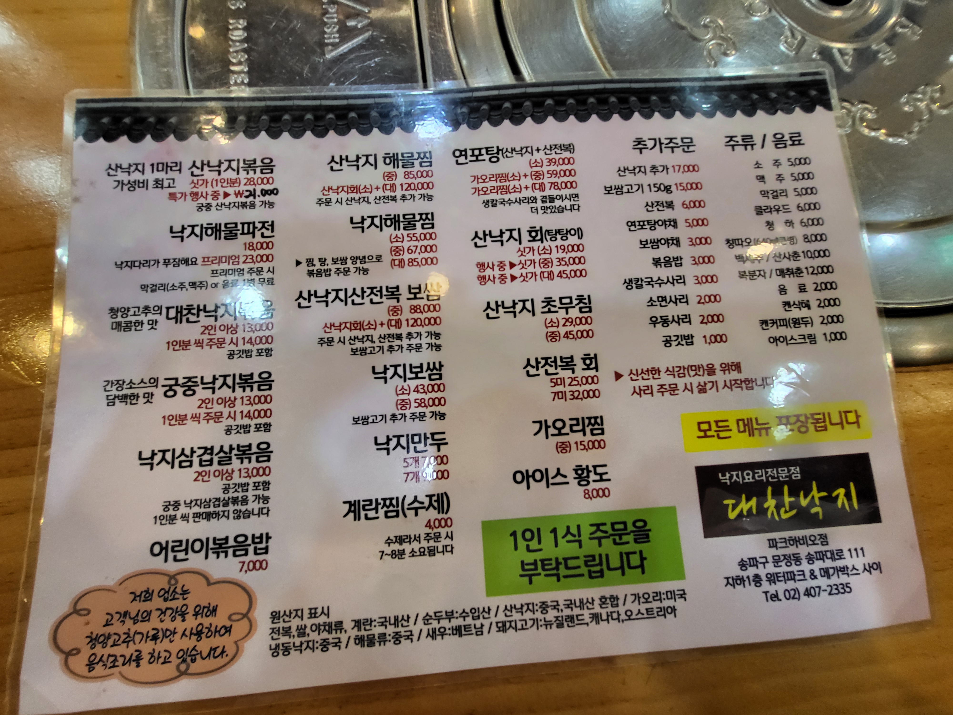 이곳은 대표메뉴인 낙지볶음 외에도 연포탕 산낙지회 감자전 등등 다양한 음식 판매하고 있었어요.